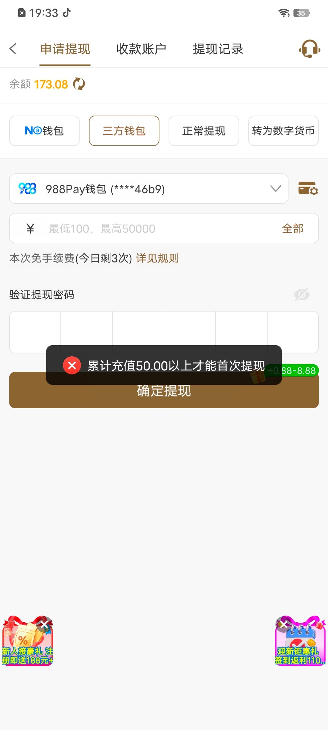 电话特邀提现要充值50能充吗?