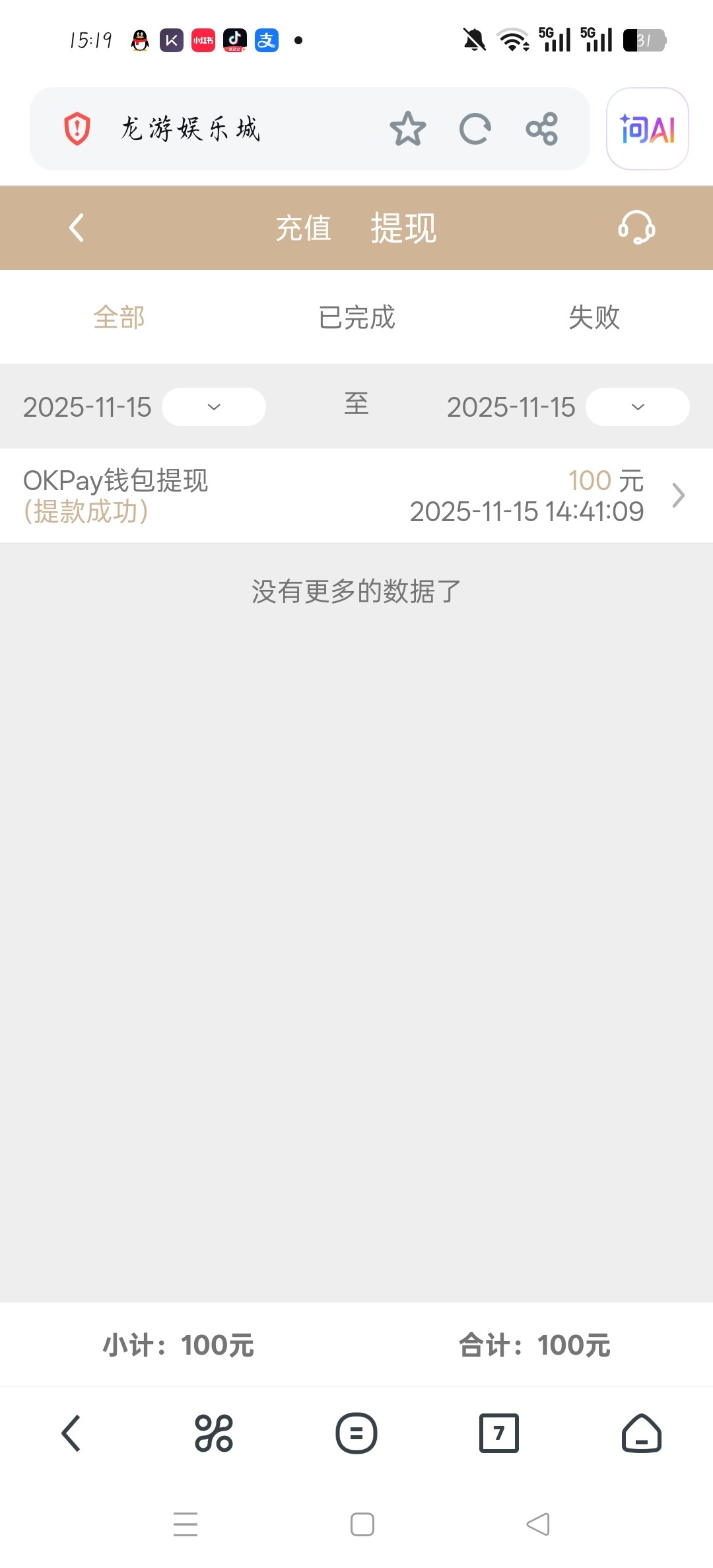 yangqijun123 这玩意儿水挺大的打到2000多提现500直接给我扣除了什么记录都没有了然后500也不见了 最后100的提  边提边玩提到账了400一直没到账的